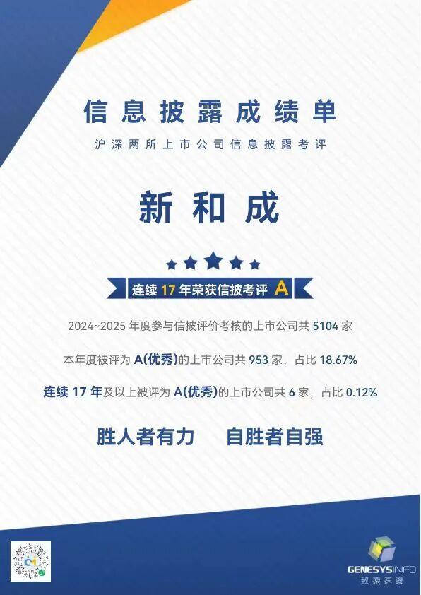 近日,深圳證券交易所公布了深市上市公司2024~2025年度信息披露考評(píng)結(jié)果,新和成以整體運(yùn)作規(guī)范、高質(zhì)量的信息披露再次獲得最高評(píng)級(jí)A。目前,僅有6家上市公司連續(xù)17年獲此殊榮,占比0.12%,新和成位列其中。這一成績(jī)不僅彰顯監(jiān)管部門、市場(chǎng)與投資者對(duì)新和成信息披露質(zhì)量、公司治理規(guī)范的高度認(rèn)可,更是公司具備長(zhǎng)期投資價(jià)值的有力印證。